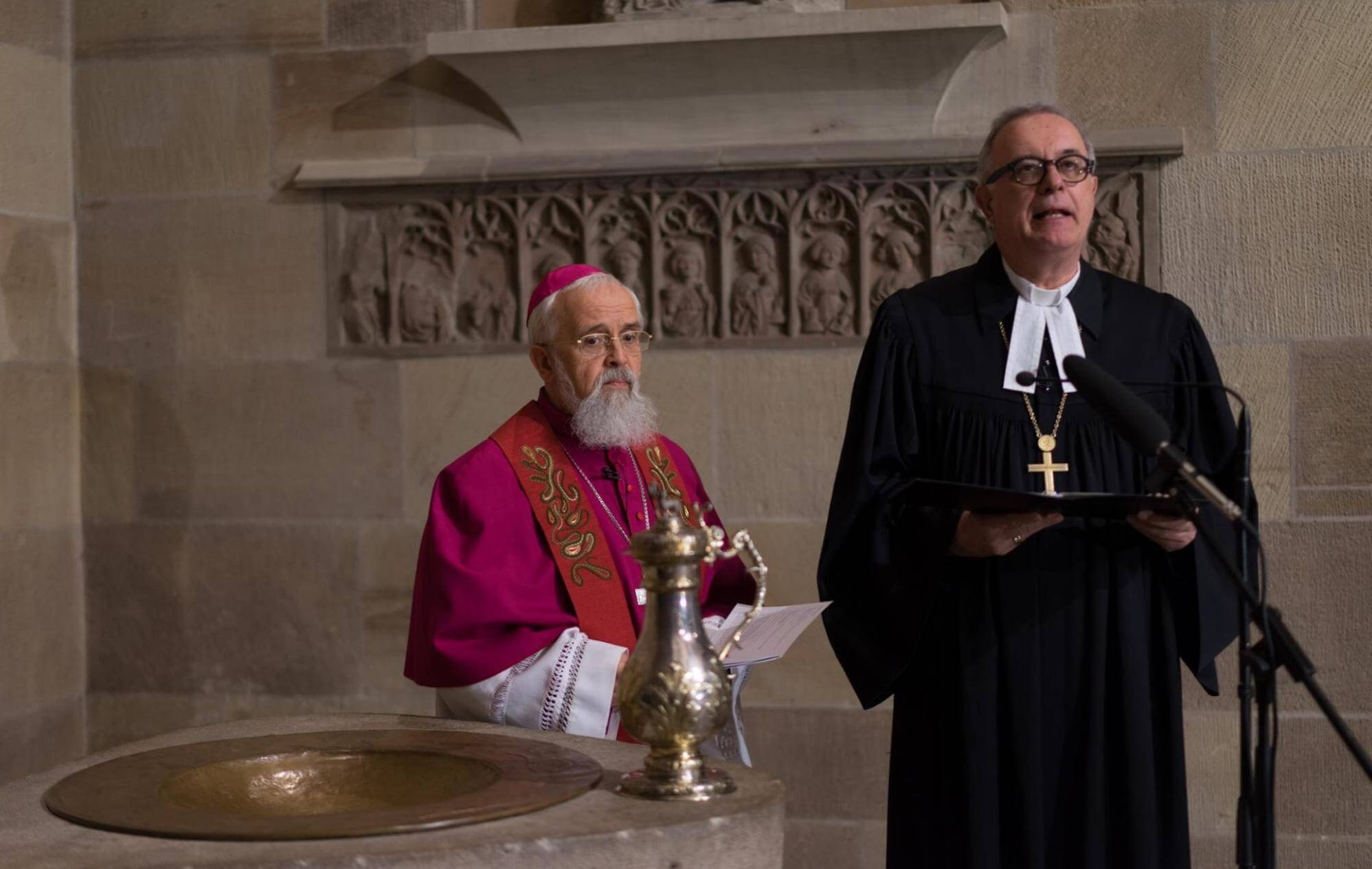 Bei einem anschließenden Empfang im Alten Schloss würdigte Erzpriester Radu Constantin Miron, der Vorsitzende der Arbeitsgemeinschaft Christlicher Kirchen in Deutschland, in einem Grußwort die Bedeutung der Gemeinsamen Erklärung.