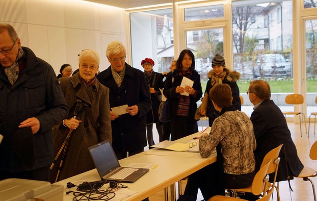 Landesbischof Dr. h. c. Frank Otfried July und seine Frau Edeltraud wählten am späten Vormittag im Gemeinedehaus der Stuttgarter Christuskirchengemeinde - sie waren nicht die ersten: Kurz nach 11 Uhr betrat als erste Wählerin eine junge Frau das Wahllokal, um ihre bereits zuhause ausgefüllten Stimmzettel in die Urne zu werfen.