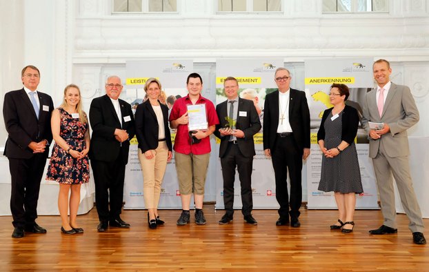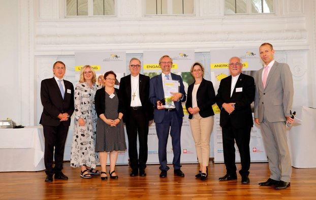 Für die Bäckerhaus Veit GmbH aus Bempflingen nahm Johannes Klümpers die Auszeichnung entgegen. Links neben ihm (v.l.n.r.) Oberkirchenrat Dieter Kaufmann (Vorstandsvorsitzender des Diakonischen Werks Württemberg, Bettina Schmauder (Bund der Selbstständigen Baden-Württemberg e. V.), Dr. Anette Holuscha-Uhlenbrock (Vorstand des Caritasverbandes der Diözese Rottenburg-Stuttgart) und Landesbischof Dr. h. c. Frank Otfried July. Rechts neben ihm Wirtschaftsministerin Dr. Nicole Hoffmeister-Kraut, Bischof Dr. Gebhard Fürst und Moderator Helge Thun.