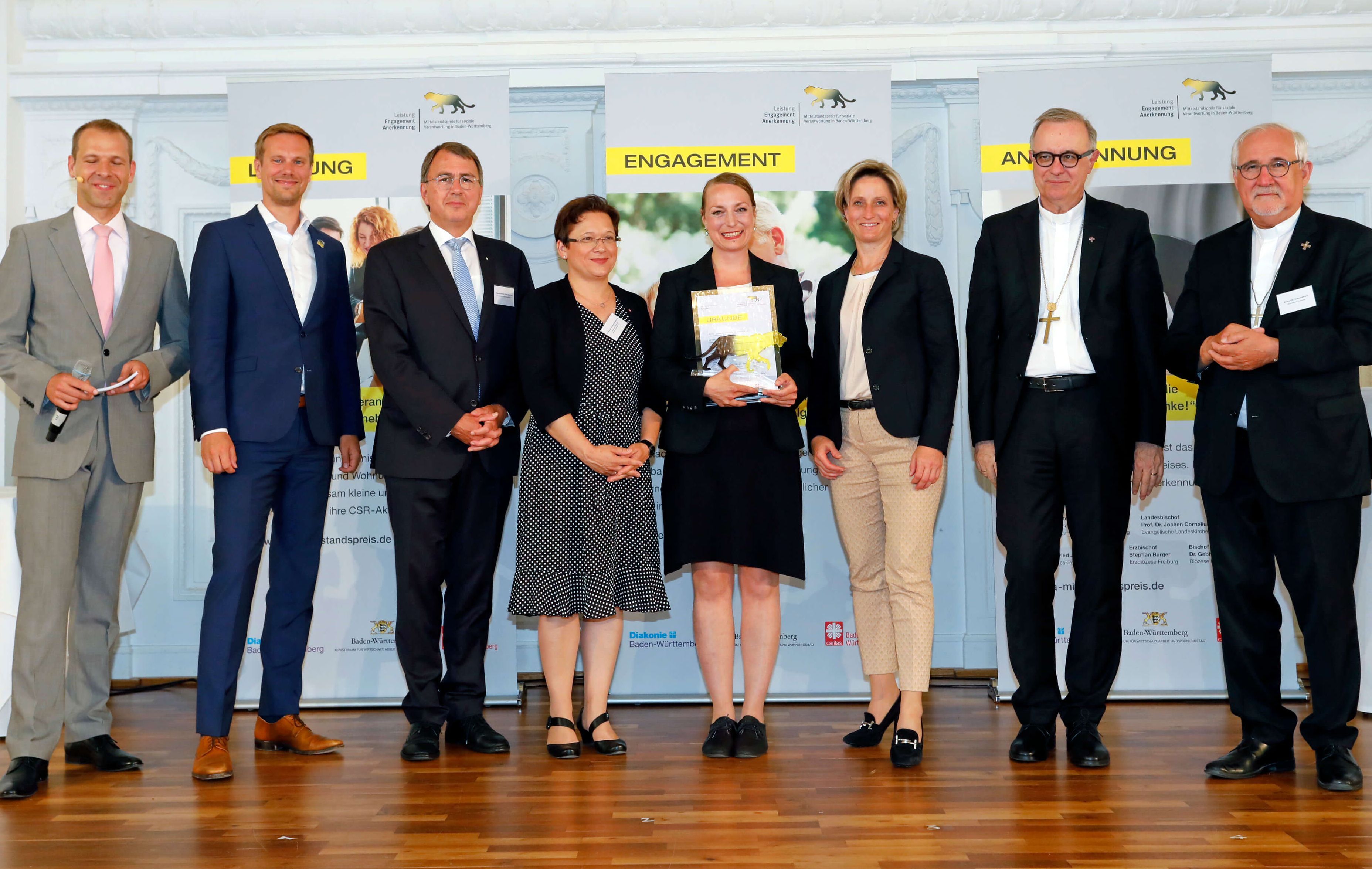 Kathrin Wortmann von der travel-to-nature GmbH Heitersheim hat die Auszeichnung in der Kategorie I für Betriebe mit bis zu 20 Beschäftigten entgegengenommen. Links neben ihr (v.l.n.r.) Helge Thun (Moderator), Andreas Sütterlin (Wirtschaftsjunioren Baden-Württemberg), Oberkirchenrat Dieter Kaufmann (Vorstandsvorsitzender des Diakonischen Werks Württemberg) und Dr. Anette Holuscha-Uhlenbrock (Vorstand des Caritasverbandes der Diözese Rottenburg-Stuttgart). Rechts neben ihr Dr. Nicole Hoffmeister-Kraut, Ministerin für Wirtschaft, Arbeit und Wohnungsbau, Landesbischof Dr. h. c. Frank Otfried July und Bischof Dr. Gebhard Fürst.