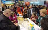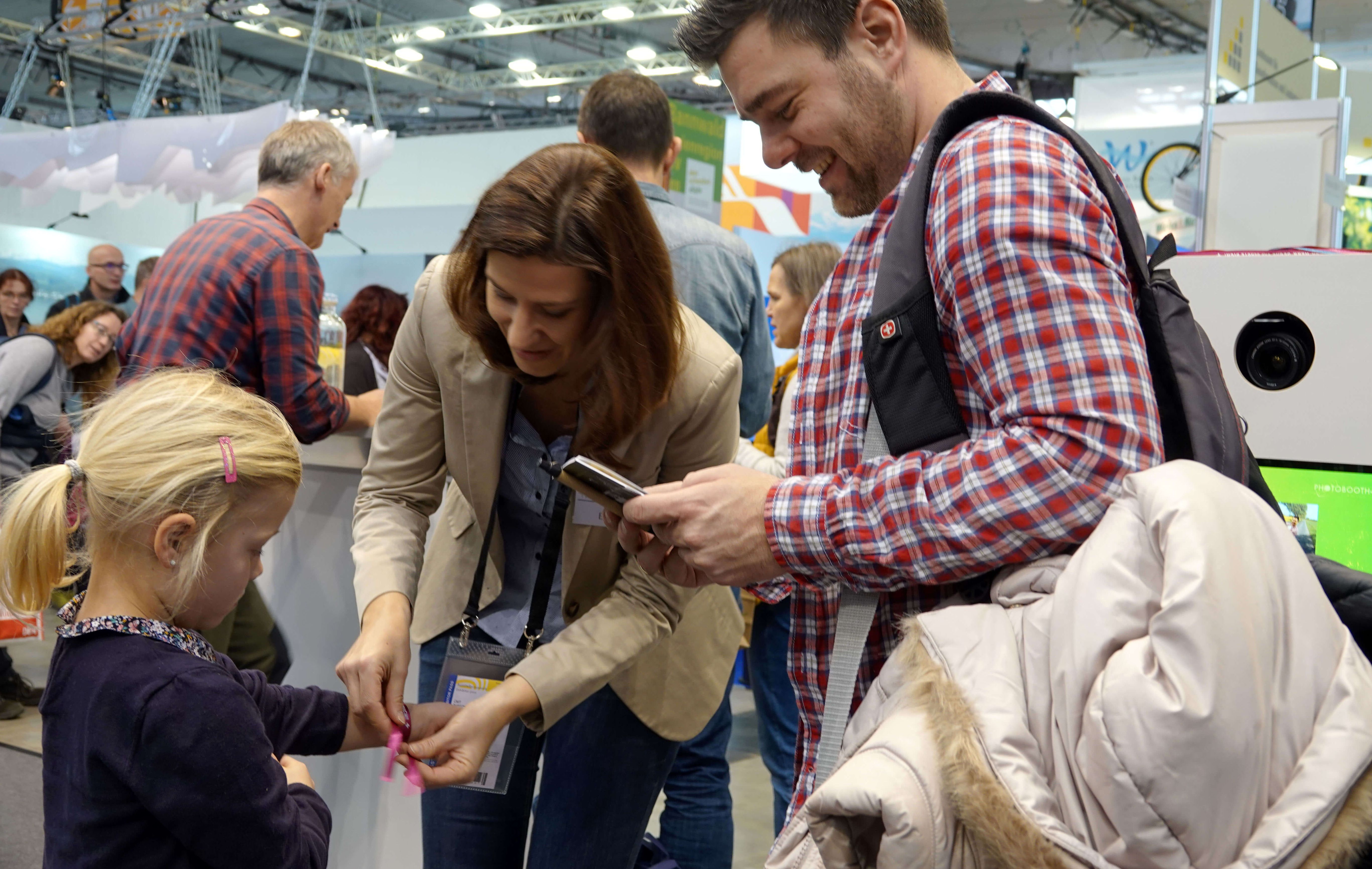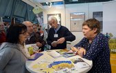 „Diese Aktion ist der Eisbrecher“, sagt Katja Boch von der Erzdiözese Freiburg mit einem zufriedenen Lächeln. Gemeinsam mit ihrer Kollegin Ulrike Spießl kümmert sie sich um die kirchliche Fotoaktion, die oft nicht einfach mit der Übergabe eines Bildes endet: Wer will, kann sich die Aufnahme auch per Mail zuschicken lassen, erhält zudem ein Armbändchen mit einem Segensspruch - und kommt mit den Standbetreuern schnell ins Gespräch.