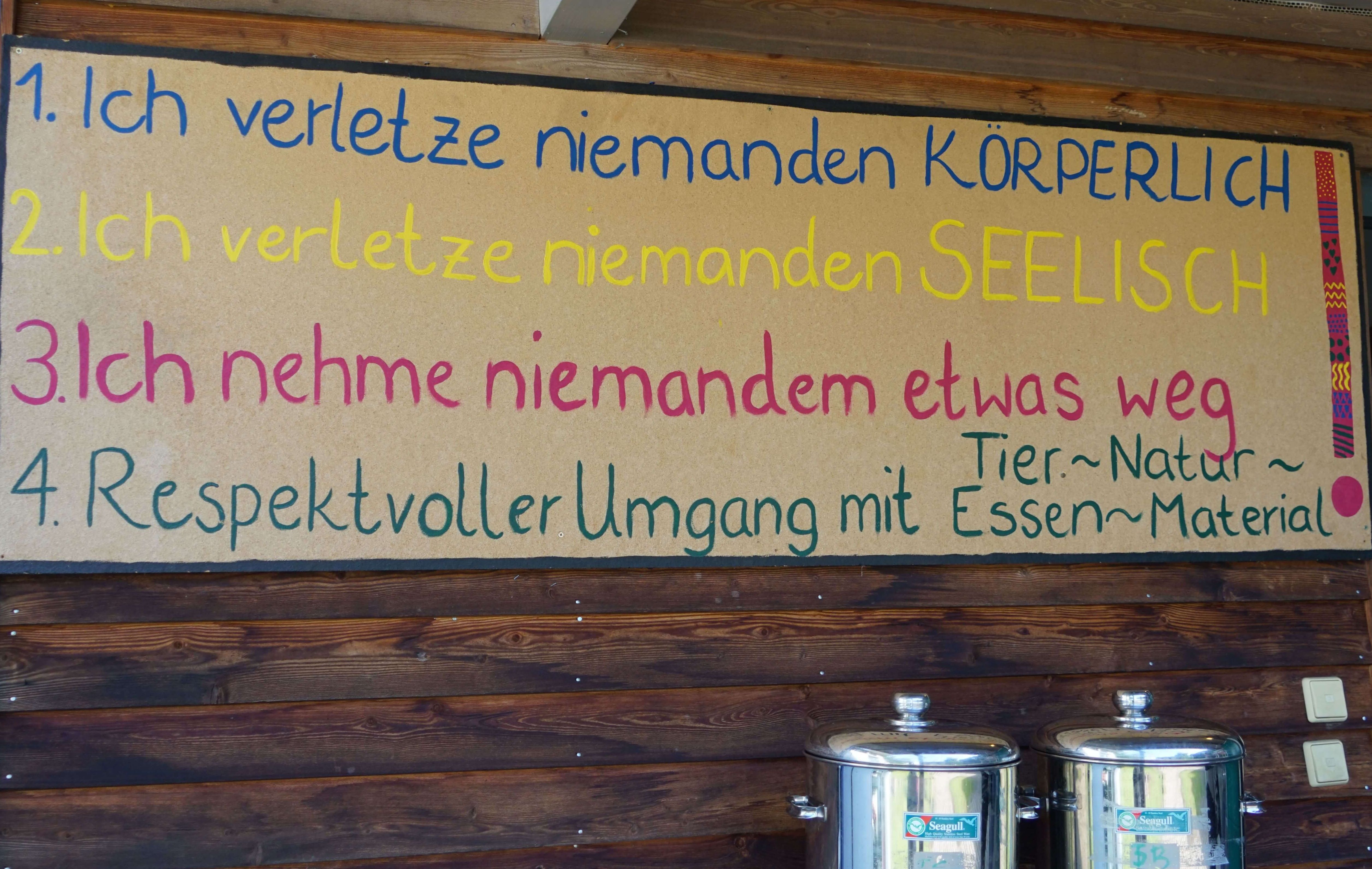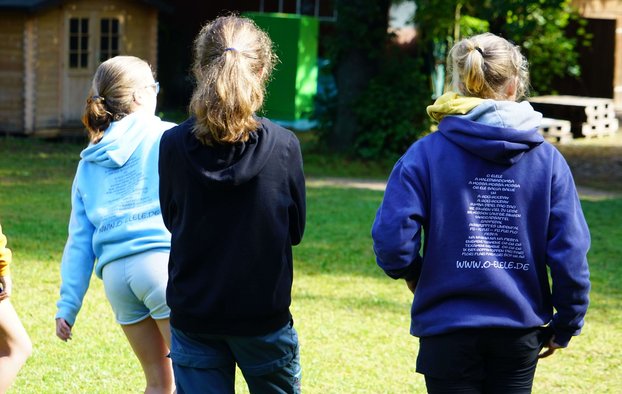 Einige Kinder wischen gerade die Bierbänke vor den großen Zelten ab, auf denen noch die Frühstücksmarmelade klebt. Andere rennen bereits mit einem Ball über die Wiese oder hängen am Kletterfelsen. Eine Gruppe größerer Kinder, alle mit Helmen auf dem Kopf, stellt sich mit den Fahrrädern auf. Für sie steht ein Ausflug ins Freibad auf dem Programm.