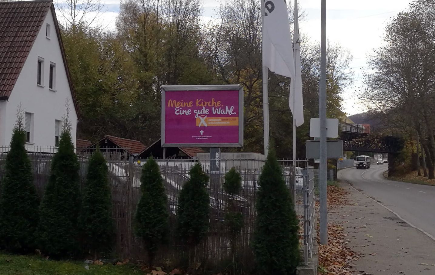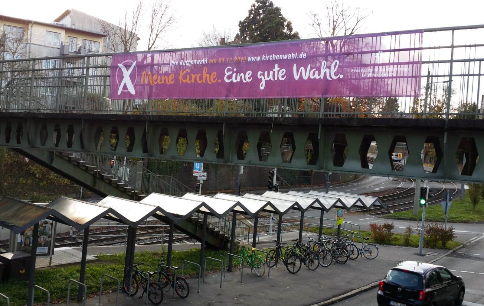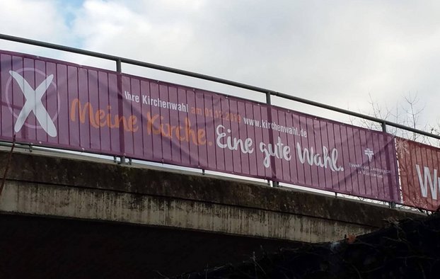 Seit Wochen bereits machen Aushänge in Mitteilungskästen, Internet-Videos sowie Plakate auf den Wahltermin aufmerksam, um möglichst viele der 1,75 Millionen wahlberechtigten Mitglieder der Evangelischen Landeskirche in Württemberg zur Stimmabgabe zu motivieren. Seit Montag hängen nun auch über den Einfallstraßen nach Stuttgart acht große Banner im unübersehbaren Violett der Landeskirche und dem Slogan „Meine Kirche. Eine gute Wahl.“