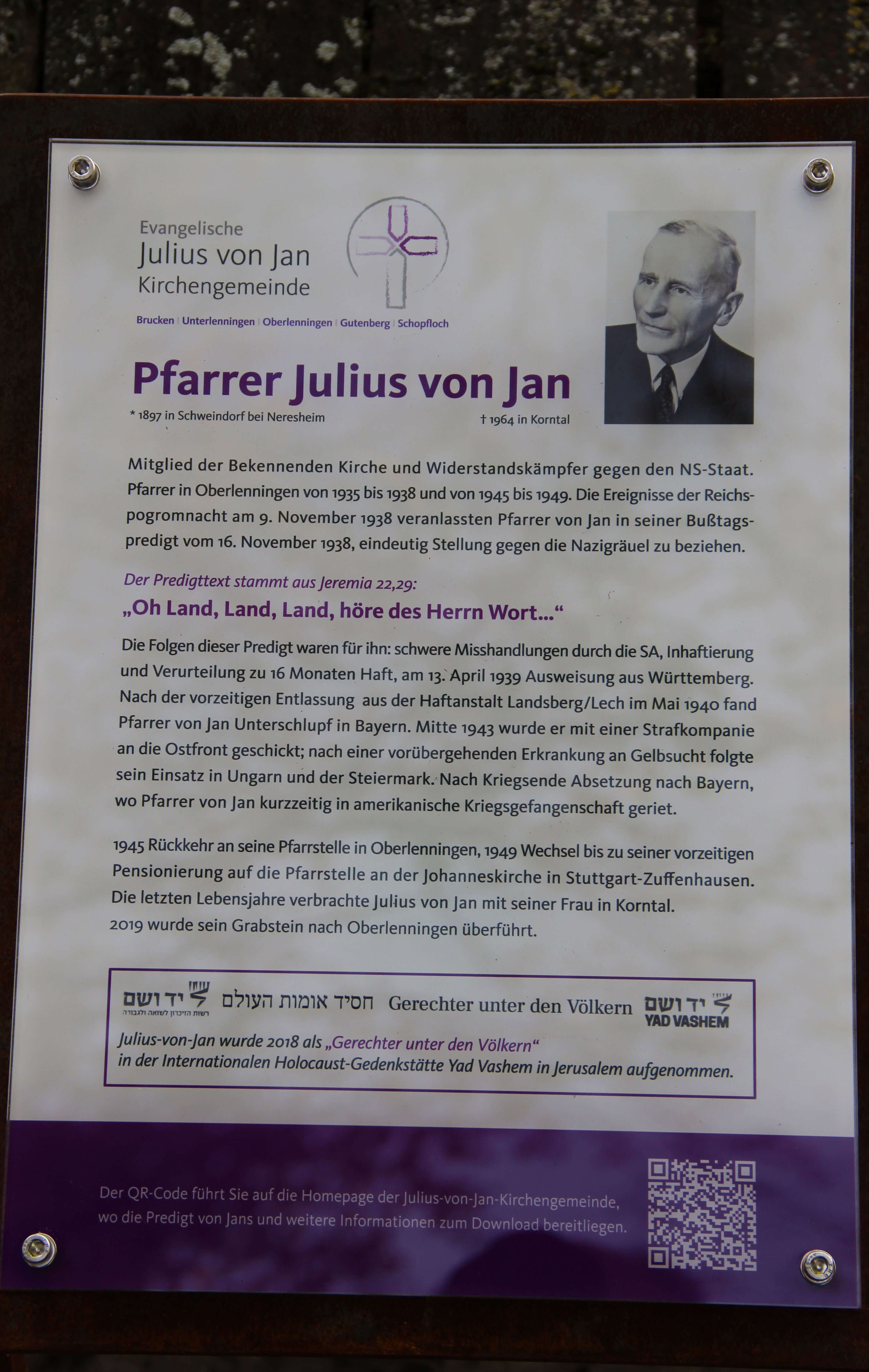 „O Land, Land, Land, höre des Herrn Wort“: Diesen Ruf des Propheten Jeremia wählte Julius von Jan damals als Predigttext. Wie einst Jeremia das Verhalten der Fürsten des Volkes Israel verurteilte, die das Gesetz Gottes mit Füßen getreten haben, so prangerte der Oberlenninger Pfarrer in seiner Predigt die Hetze der „Fürsten“ des Dritten Reiches gegen jüdische Mitbürger an: „Gotteshäuser, die anderen heilig waren, sind ungestraft niedergebrannt worden, das Eigentum geraubt oder zerstört und Männer, die dem deutschen Volk treu gedient haben, wurden ins KZ geworfen.“