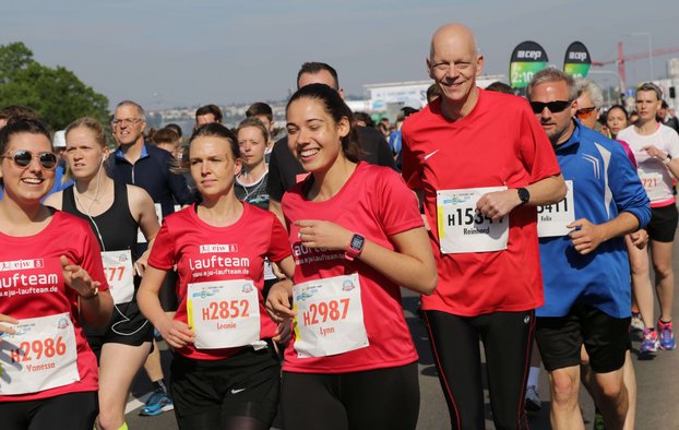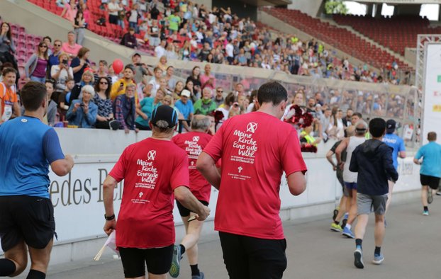 Das Team war sogar größer als von den Organisatoren zunächst erwartet: Waren wenige Tage vor dem Großereignis 84 Teilnehmer gemeldet, streiften sich am Sonntag insgesamt 87 Hobbysportler die roten EJW-Shirts über; in diesem Jahr machten sie mit ihrer Aufschrift „Meine Kirche. Eine gute Wahl“ gleichzeitig Werbung für die Teilnahme an den Kirchenwahlen am 1. Dezember.