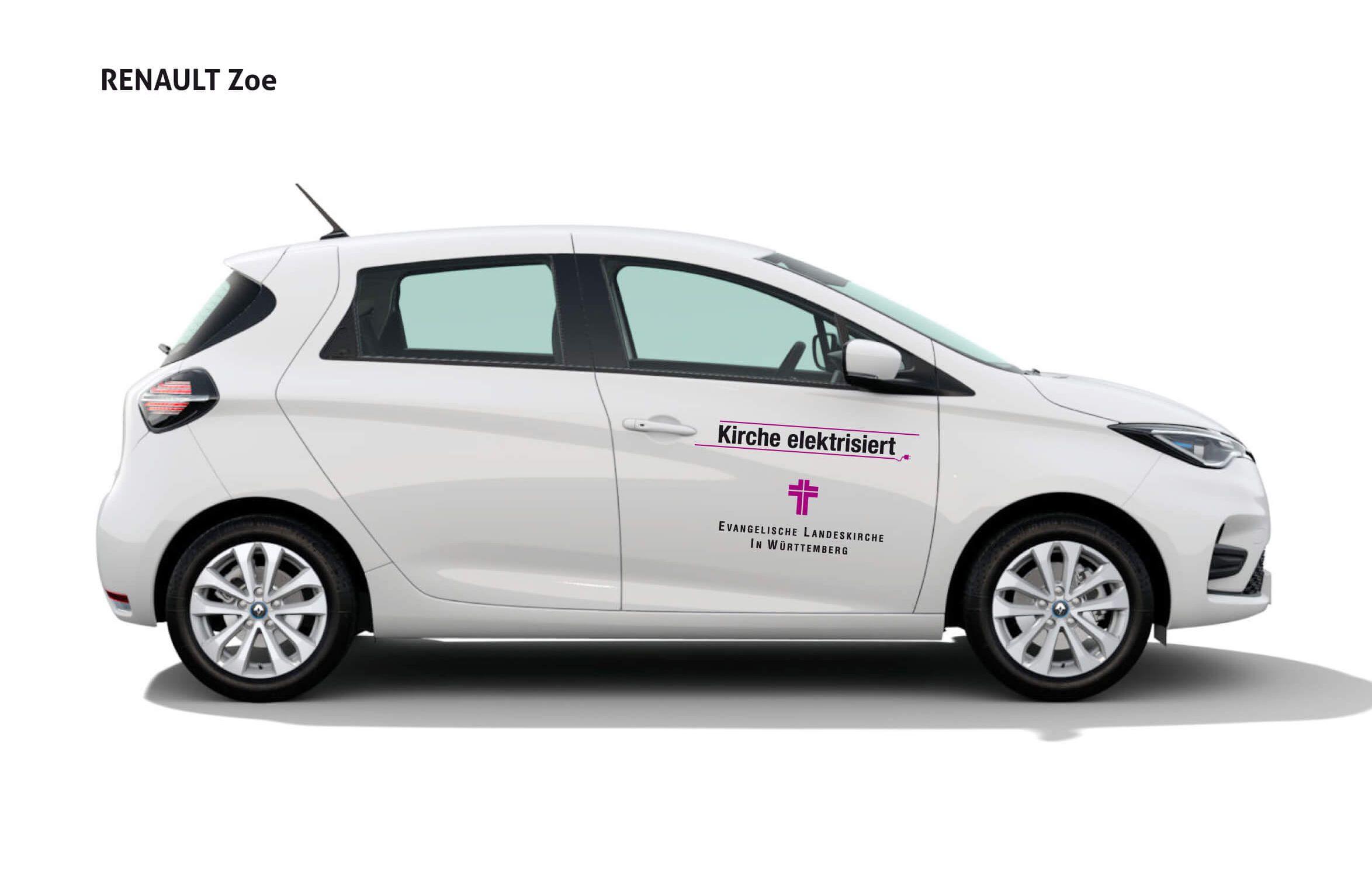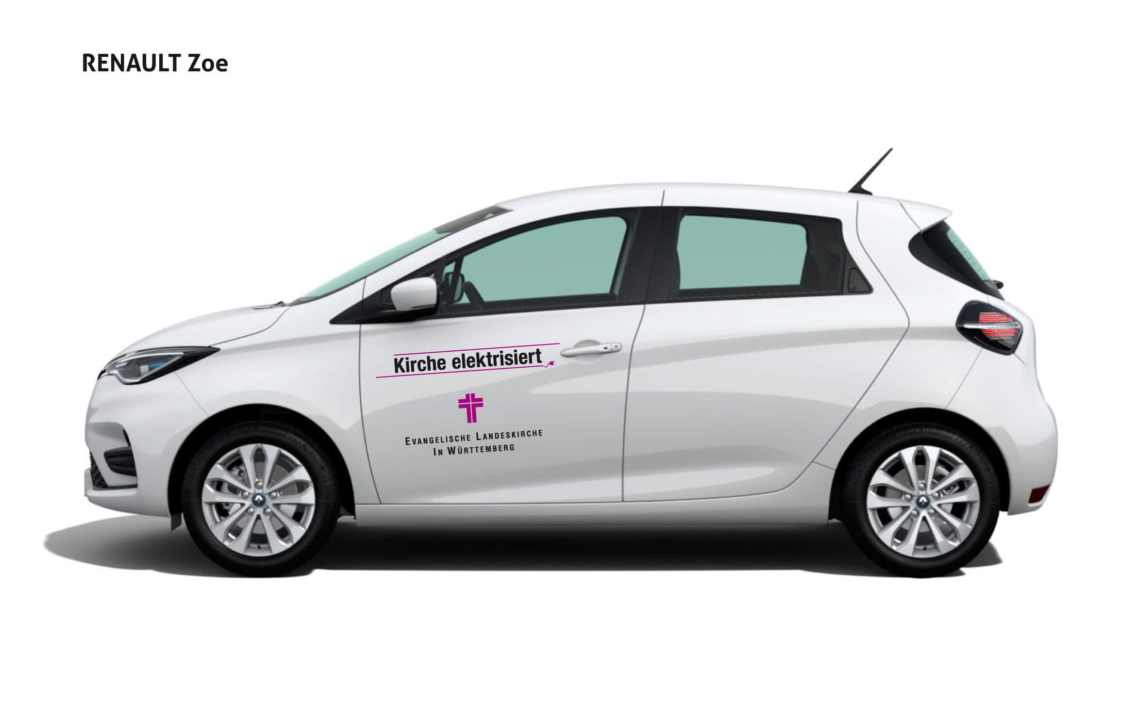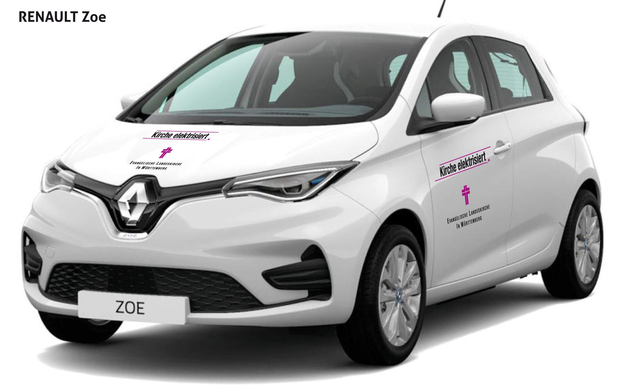 Die Beifahrerseite des Renault Zoe mit dem „Kirche elektrisiert“-Logo.