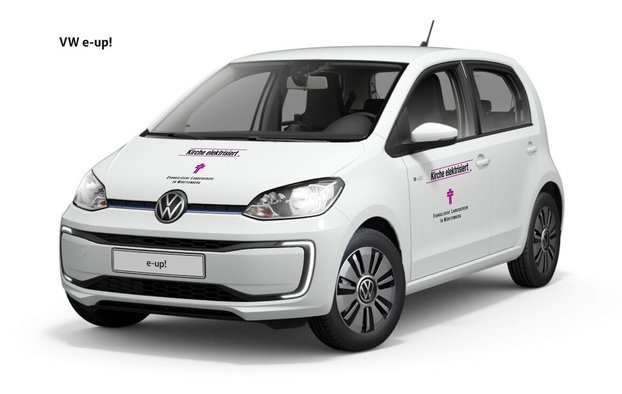 Der VW E-Up von vorne mit dem Logo „Kirche elektrisiert“.