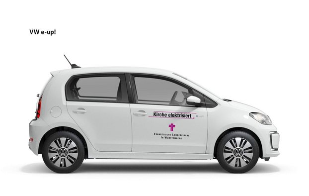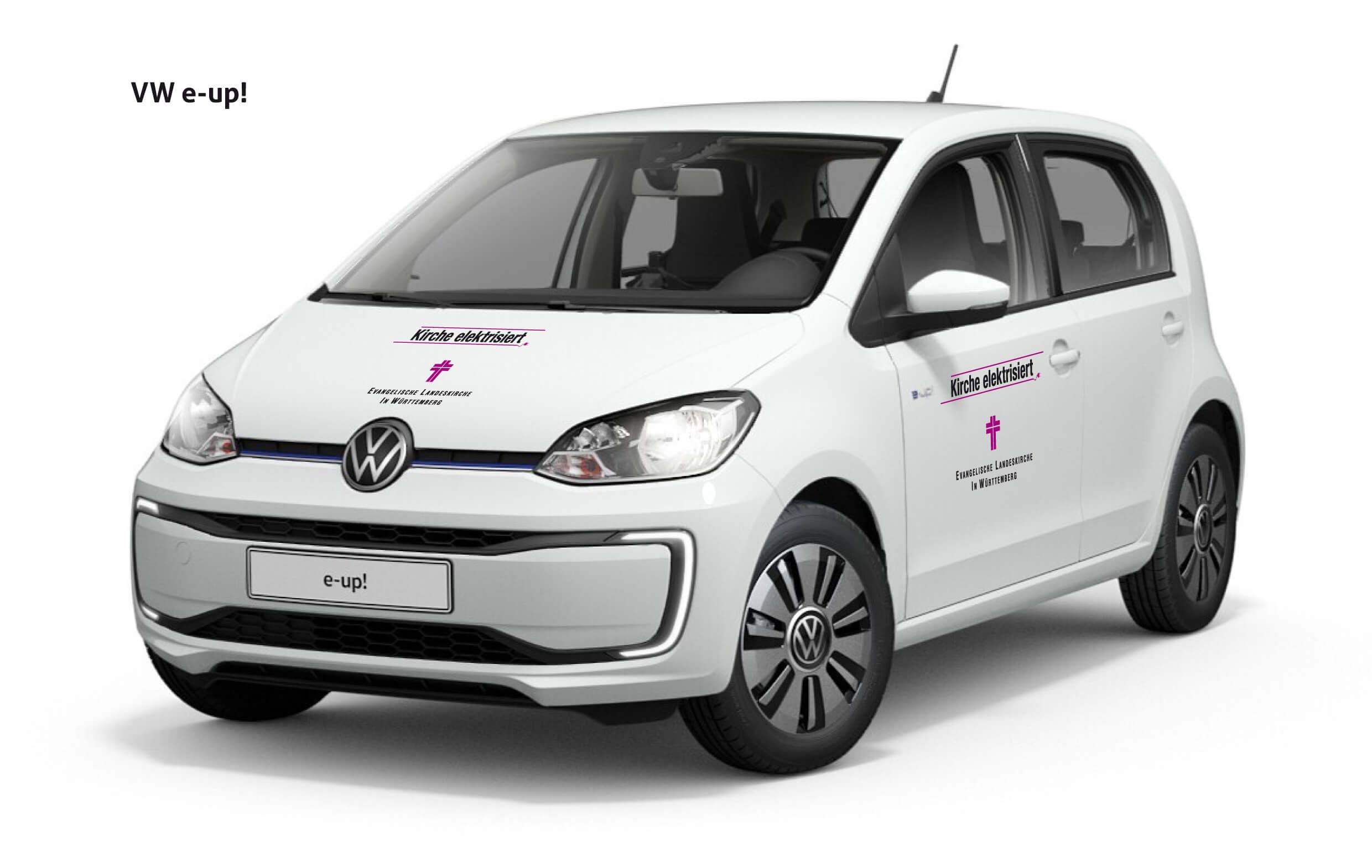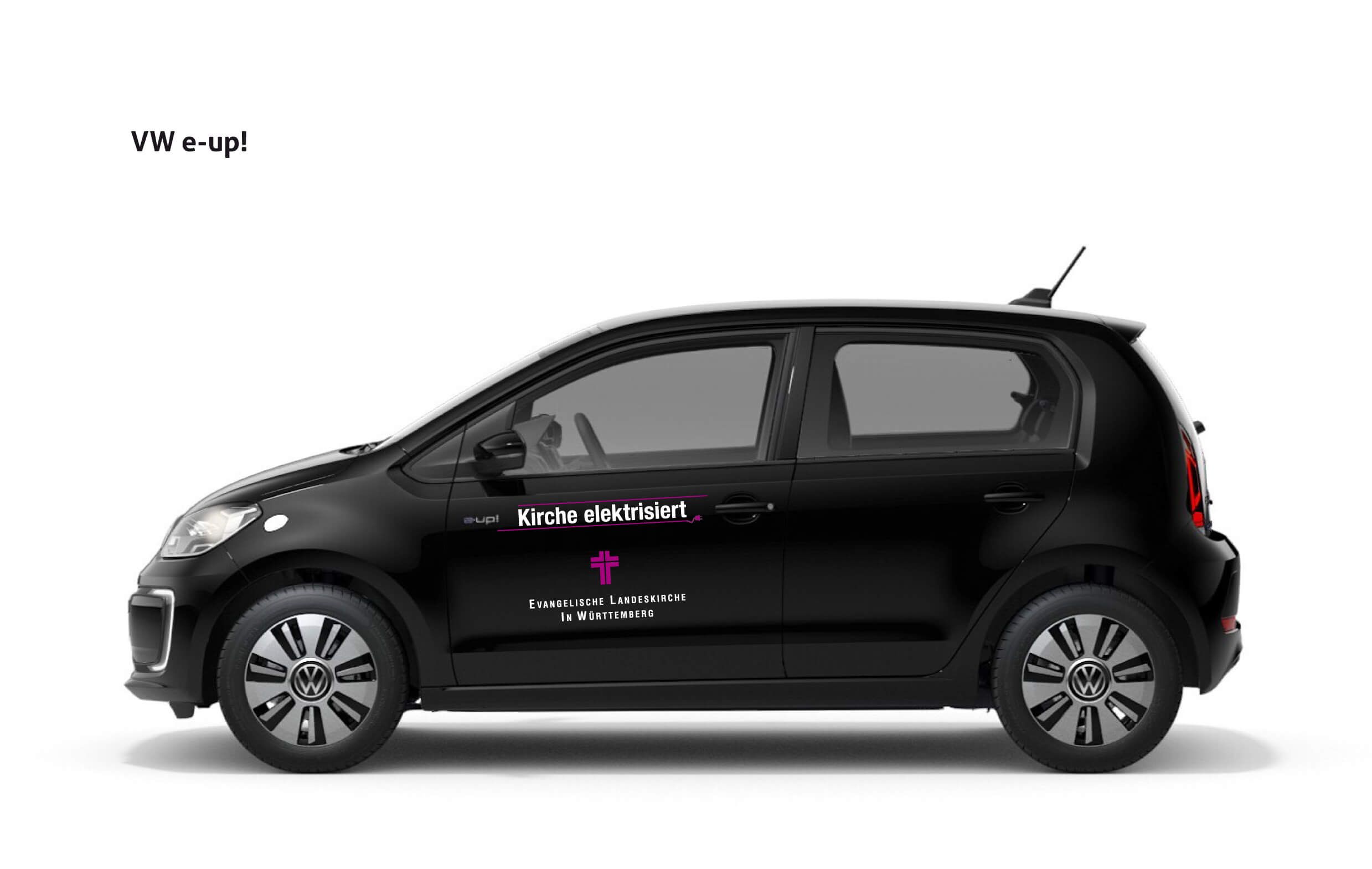Die Fahrerseite des E-Up mit dem Logo „Kirche elektrisiert“.