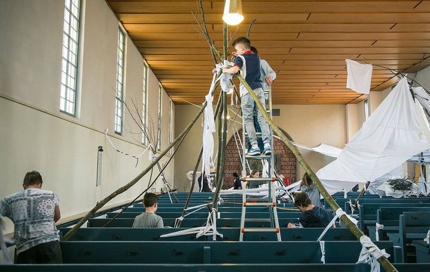 Im Kirchenraum hat sich eine große zeltartige Skulptur aus Ästen und weißen Stoffen entwickelt. Thomas Putze hat die Materialien bereits im Vorfeld aus den Gärten und Schränken vieler Gemeindeglieder bekommen. Im Kirchenraum verbindet sich dieses Material – ein starkes Symbol für Kirche.
