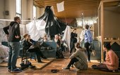 Die Studierenden der Kunstakademie arbeiten gemeinsam an einem Projekt. Sie bauen begehbare Kabinen über die Kirchenbänke. Diese werden in den nächsten Tagen mit Video- oder Soundarbeiten bestückt. Sie dienen als Rückzugsort oder Performancefläche.