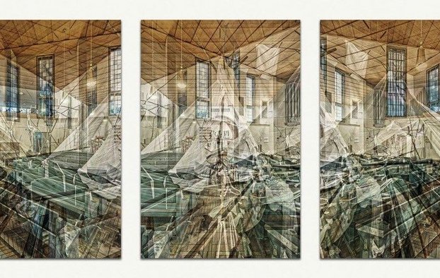 Neben seinen Dokumentationen entwickelt der Panoramafotograf Josh von Staudach Ideen für freie Arbeiten, die beispielsweise zu dem Triptychon führen, das er im Eingangsbereich der Kirche aufgehängt hat.