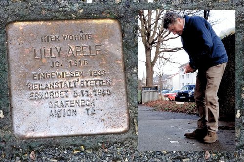 Anlässlich des Gedenktags an die Opfer des Nationalsozialismus besuchte Landesbischof Ernst-Wilhelm Gohl den Stolperstein in der Karl-Kloß-Str. 42 in Stuttgart und erinnerte an die vierundzwanzigjährige Frau Lilly Abele, die im Rahmen der NS‑„Euthanasie“-Verbrechen aufgrund ihrer geistigen Behinderung im Jahr 1940 in Grafeneck ermordet wurde.