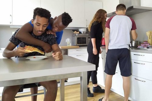 Jana Lehmann mit „ihren“ Jungs in der Küche der Wohngruppe in Esslingen.