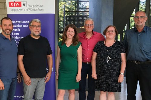 Dr. Anna Christmann MdB (Bündnis 90/Die Grünen) zu Besuch im EJW (von links nach rechts); Dieter Braun (Fachlicher Leiter des EJW), Eberhard Fuhr (Pressesprecher des EJW), Dr. Anna Christmann (MdB), Robby Höschele (Jugendpolitik), Ursel Braun (Freiwilligendienst), Klaus Stoll (Freiwilligendienst)