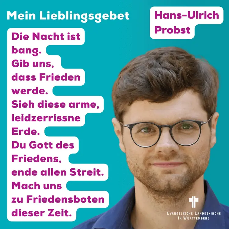 „Abends, wenn ich unsere beiden Kinder ins Bett bringe, singen wir häufig gemeinsam das Lied 'Der Abend kommt' von Jörg Zink“, erzählt Hans-Ulrich Probst. „Es ist für mich zu einem Hoffnungs- und Trostlied und damit zu einem gesungenen Gebet geworden. Es bringt für mich das Mitleiden an einer friedlosen Welt, aber eben vor allem die Sehnsucht nach Gerechtigkeit, nach Frieden zum Ausdruck. Gerade in den aktuellen Zeiten spreche ich es nicht nur abends immer wieder für mich und vertraue darauf, dass der Wunsch und die Bitte nach Frieden von so vielen Menschen endlich erhört wird.“