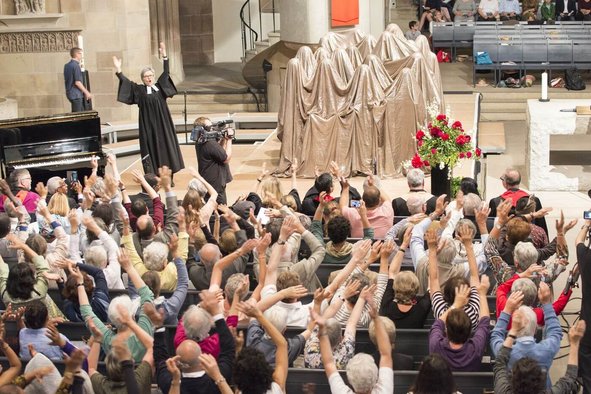 Gemeinsam mit der katholischen Theologin Affia Rose Hermle hielt er eine dialogische Predigt. Sie berichtete von den Schwierigkeiten der Christen in ihrer Heimat Pakistan. Seit den 1980er-Jahren gelten die strengen Blasphemie-Gesetze, die Christen lebten in ständiger Angst und dürften nur niedrige Arbeiten verrichten. Doch Freiheit beschränke sich nicht auf die äußeren Umstände. „Gott kann uns eine innere Freiheit schenken“, so Hermle. Das Wort „Freiheit“, sagte Landesbischof July in seinem Predigtteil, sei in der Menschheitsgeschichte beschmutzt und besudelt worden. „Wir werden es nicht zulassen, dass diese Freiheit durch Nationalismen und Hetze in die Enge getrieben wird!“