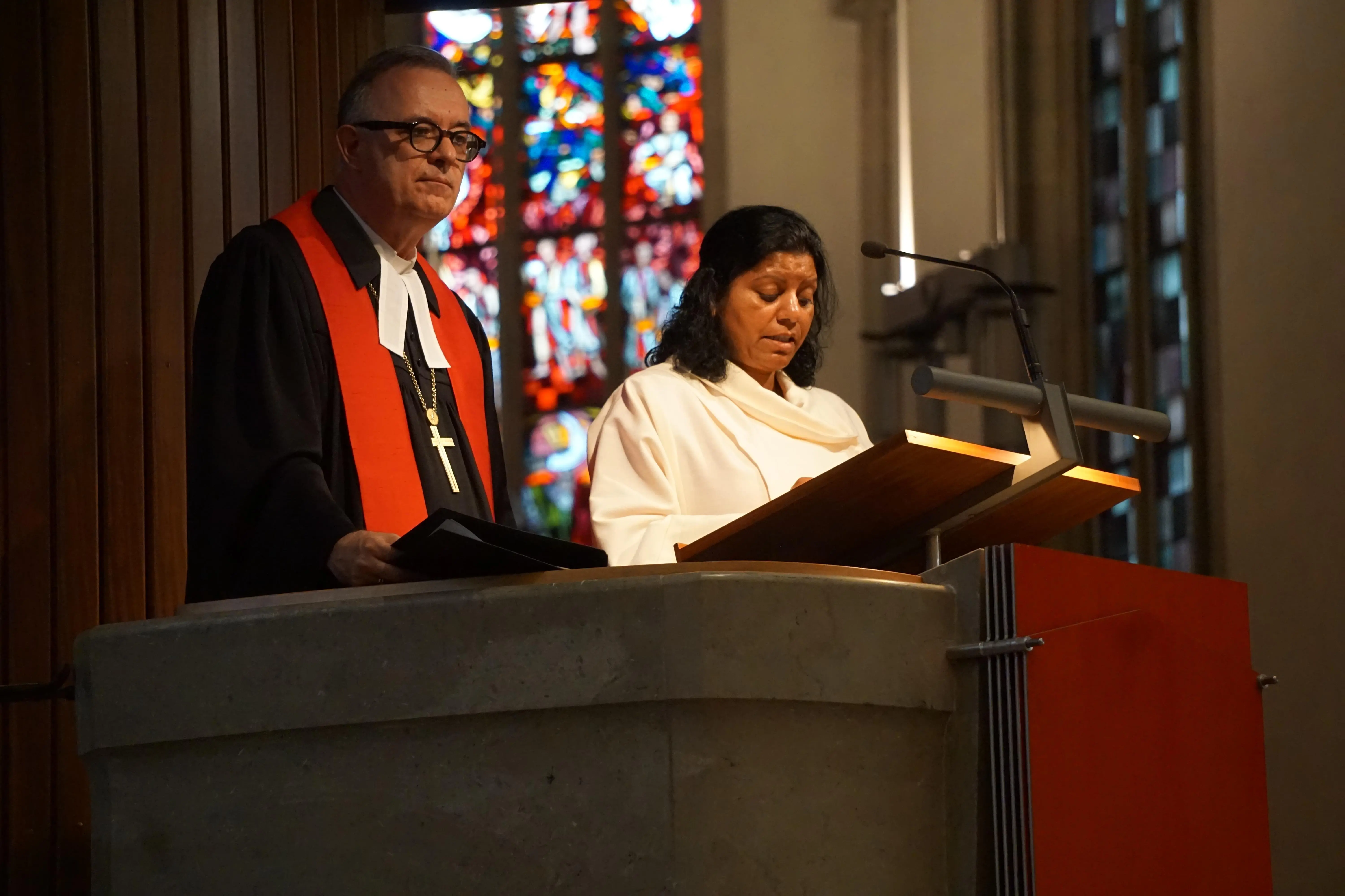 Im Gottesdienst stellten Teilnehmer eines internationalen Performance-Workshops die Pfingstgeschichte bildhaft und symbolisch und unter Einbeziehung der Gemeinde dar. In seiner Dialogpredigt mit der pakistanischen Theologien Affia Rose Hermle betonte Landesbischof July, „wie dankbar wir für unsere – auch äußere – Freiheit hierzulande sein dürfen.“ Er verwies auf die Bedeutung der Freiheit, die aber immer wieder ausgenutzt und besudelt werde. „Wir werden es nicht zulassen, dass diese Freiheit durch Nationalismen und Hetze in die Enge getrieben wird!“ Hermle berichtete aus ihrer Heimat Pakistan, wo die Angst der Christen zunähme. Schutz fänden sie nur in der inneren Freiheit, die sie durch den Glauben erlangen.