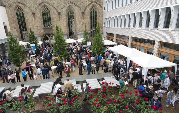 Nach dem Gottesdienst zog die „Parade der Freiheit“ von der Stiftskirche zum Hospitalhof, der dortige „Campus“ mit Innenhof und Hospitalkirche erwies sich beim wechselhaften Wetter als ideal. Die Informationsstände waren gut besucht. Wer wollte, konnte Afrika zusammenpuzzeln, sich mit Literatur eindecken oder sein ausgedientes Handy abgeben. Es wurden etwa 50 Stück gesammelt. Gegessen wurde irgendwann zwischendurch mit Speisen aus vielen Ländern. Nur Landesbischof July kam bis zum Schluss nie dazu.
