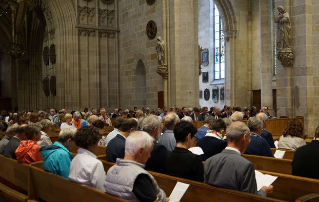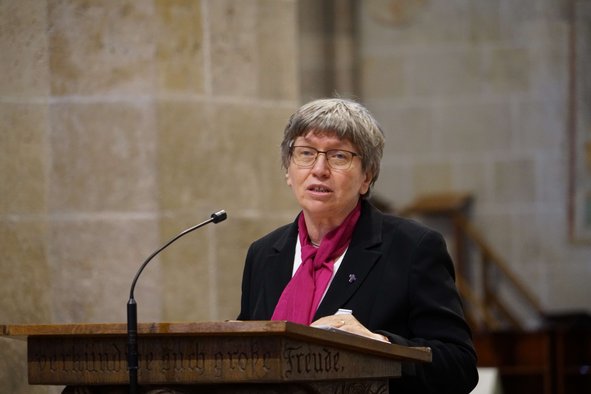 Im Gottesdienst am Nachmittag im Ulmer Münster mit Landesbischof Dr. h. c. Frank Otfried July und Synodalpräsidentin Inge Schneider sagte July in seiner Predigt: „Wir sprechen in der Kirche oft von der ‚Einheit der Verschiedenen‘ in Jesus Christus.“ Diese Rede von der Einheit höre man oft als gut gemeinten Versöhnungssatz, als Appell und Beschwörung zum Beispiel in Predigten, Erklärungen und Bischofsworten. „Aber im Alltag bleiben Gräben“, so July weiter. Es fehle eine echte, ernstgemeinte Alltagspraxis dieser „Einheit der Verschiedenen“. Kirche sei nicht die Gemeinschaft der Macher, der Helden, der Heiligen, der Wissenden. „Kirche, das ist die Gemeinschaft der Auf-Christus-Angewiesenen, der Scheiternden, der Schmutzigen, der Unreinen, denen Christus entgegenkommt“, so July. „Mit Christus verbunden zu sein, heißt dort zu sein, wo Menschen leiden. Das heißt, dort treu zu bleiben, da zusammenzuhalten, wo Menschen um der Gerechtigkeit, um Christi willen verfolgt werden“, so der Landesbischof.