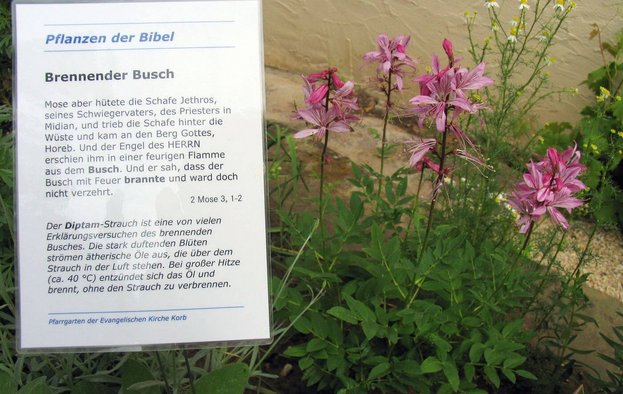 Wer die schmale Treppe am Alten Pfarrhaus in Korb hochsteigt, landet im sumpfigen Jordantal. Weiter hinten, wo der Feigenbaum und eine große Pinie wachsen, befindet sich der waldige Norden Israels. Dazwischen blühen Blumen des Feldes wie die Hundskamille, die Kronenmargerite oder das Sonnenröschen. Der Bauerngarten an der Außenmauer symbolisiert die fruchtbare Jesreelebene zwischen Galiäa und Samaria. Dort wachsen Gewürze, Kichererbsen, Hirse und Weizen. Dahinter sprießen die Disteln und Dornen. Ein Garten wie das Heilige Land – das ist der Bibelgarten der Evangelischen Kirchengemeinde Korb im Remstal. Der liebe Gott hätte sein Wohlgefallen daran.