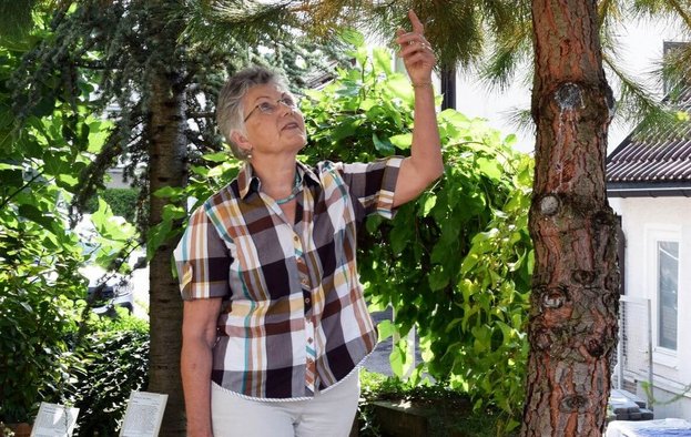 Im Frühjahr ging es dann los: Zusammen mit zehn weiteren Mitstreiterinnen und Mitstreitern entfernte sie alle bisherigen Pflanzen. Tagelang rissen sie den Giersch und andere Unkräuter heraus. Ein Winzer half mit seiner Weinbergfräse aus. „Und dann haben wir gepflanzt“, erzählt Christa Hahn. Etwa 50 verschiedene Pflanzenarten, die auch in der Bibel vorkommen, waren es anfangs. Dass es heute über 80 sind, liegt an Hahns grünem Daumen. „Hier“, sagt sie und zeigt auf eine etwa 15 Meter hohe Pinie, die am oberen Ende des Gartens steht, „diese Pinie habe ich selber gezogen aus einem Samen, den ich vor 18 Jahren vom Gardasee mitgebracht habe. Die stand vorher bei mir im Garten.“ Auch im Bibelgarten selbst sammelt die begeistere Gärtnerin Samen und zieht immer wieder Nachwuchs – so wie eine fast mannshohe Senfpflanze, gezogen aus einem winzig kleinen Samenkorn.