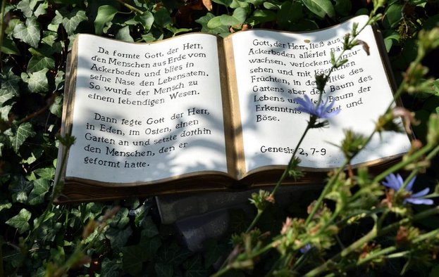 Für alle Interessierten hat Christa Hahn so manche kuriose Geschichte parat. Etwa das kleine Apfelbäumchen: „Der Apfel kommt fünf Mal in der Bibel vor, aber nicht da, wo man es vermutet“, erklärt sie. „Bei Adam und Eva ist immer nur von einer ‚Frucht‘ die Rede.“ Oder die Geschichte vom brennenden Dornbusch. Im Mai und Juni treibt der Strauch, der normalerweise in der Wüste gedeiht, violette Blüten, die stark duften. Bei Temperaturen über 40 Grad steigen die ätherischen Öle hoch, entflammen sich und brennen kurz ab. Der Busch selbst bleibt heil. Diese und andere Geschichten stehen neben den entsprechenden Bibelstellen auf den Tafeln, die sie überall aufgestellt hat.