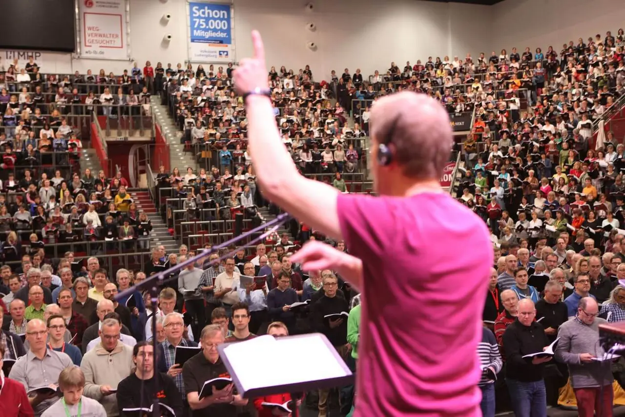 Als die Türen der MHP-Arena in Ludwigsburg geöffnet werden, strömen ohne Unterlass Sängerinnen und Sänger herein. Ein Ehepaar ist sogar extra aus dem Münsterland angereist, um zusammen mit seiner Tochter am Pop-Oratorium teilnehmen zu können. Für das Paar ist es bereits die zweite Aufführung. Schon bei der Premiere des Stücks in Dortmund haben sie mitgesungen. „Es macht einfach so viel Spaß“, rufen sie noch, dann sind sie in der Menge verschwunden.
