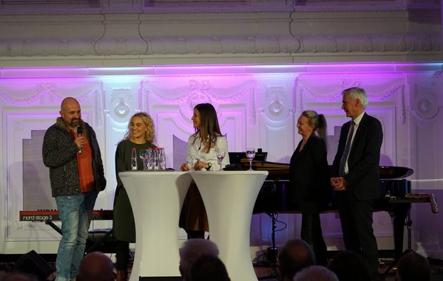 Podiumsgespräch mit Comedian Dominik Kuhn alias Dodokay, Jana Highholder, Moderatorin Stephanie Haiber, Dr. Aleksandra Sowa, Kryptologin und Leiterin des Horst-Görtz-Instituts für Sicherheit in der Informationstechnik sowie Landesbischof Professor Dr. Jochen Cornelius-Bundschuh (vlnr)