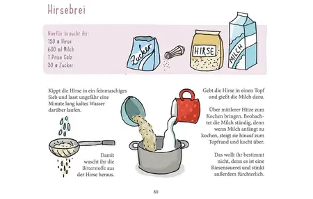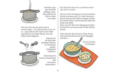 Herzhafte und süße Rezepte, Vorspeisen, Hauptspeisen, Desserts und Beilagen finden sich im Kochbuch - auch die oben abgebildeten Falafel und der Hirsebrei.