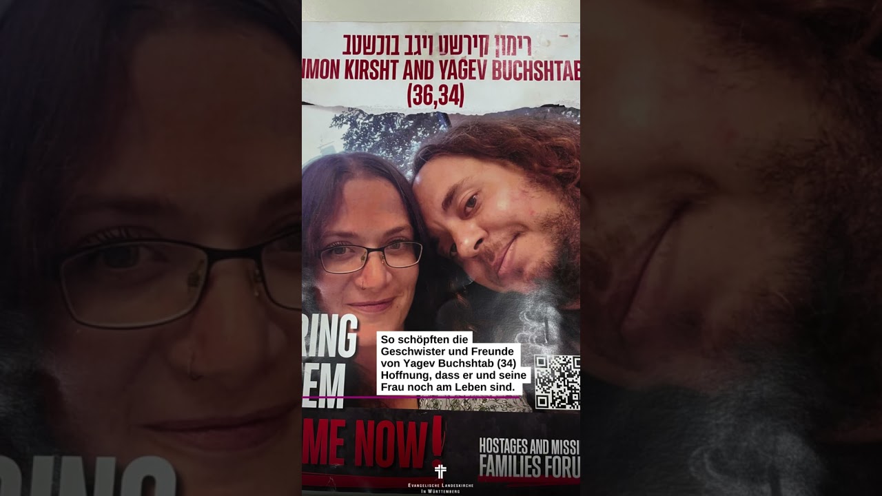 „Wir wollen ihre Geschichte erzählen und an die Entführten erinnern. Sie sind nicht nur eine Nummer“, so Yagevs Schwester Nufar. Buchshtab Freundin Ofra Raz fügt hinzu: „Die Entführten sind Familie, Kollegen, Lehrer, Freunde – bei uns kennt jeder jeden. Wir brauchen Hilfe, um jede Geisel zurückzubekommen. Es sind besondere Menschen und wir müssen ihre Gesichter zeigen.“ Ofra Raz steht vom Tisch auf, an dem das Gespräch stattfindet, und holt ein Poster, das Yagev Buchshtab mit seiner Frau zeigt. „Bring them home now!“ steht dort in großen Buchstaben neben einem Bild, das das junge Ehepaar zeigt. Kathrin Nothacker, Personaldezernentin im Oberkirchenrat der Evangelischen Landeskirche in Württemberg, sagt: „Es ist etwas anderes, die Gesichter zu sehen und die Geschichten zu hören, als nur die Zahlen zu hören. Es ist ein Alptraum, niemand hätte sich so etwas vorstellen können.“