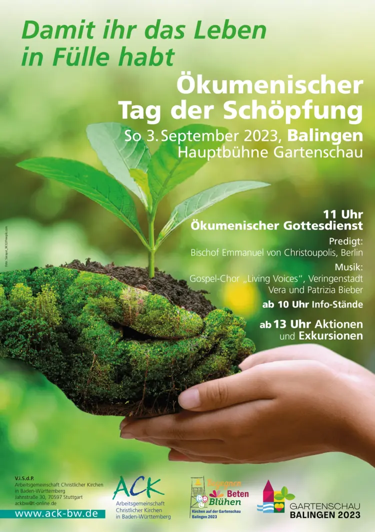 Die Arbeitsgemeinschaft Christlicher Kirchen (ACK) in Baden-Württemberg feiert den Tag der Schöpfung 2023 am 3. September mit einem zentralen Gottesdienst auf der Gartenschau in Balingen. Der Tag steht bundesweit unter dem Motto „Damit ihr das Leben in Fülle habt!“ (Johannes-Evangelium Kapitel 10,10). Die Gottesdienstimpulse kommen aus Bremen, wo die bundesweite Feier der (ACK) am 1. September stattfinden wird.