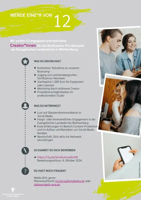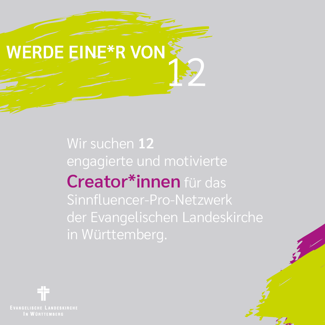 Gefragt sind Personen aus dem Raum der Evangelischen Landeskirche in Württemberg, die haupt- oder ehrenamtlich engagiert sind, bereits Erfahrung im Aufbau und Betreiben eines Social Media-Kanals und Lust auf Glaubenskommunikation haben. Gefördert werden die Sinnfluencer durch die kostenlose Teilnahme an landeskirchlichen Social Media-Vernetzungsevents, ein Startkapital für Equipment und Lizenzen in Höhe von 1.000 Euro, ein Mentoring-Programm und durch die Bereitstellung von professionellen Produktionsmöglichkeiten.
