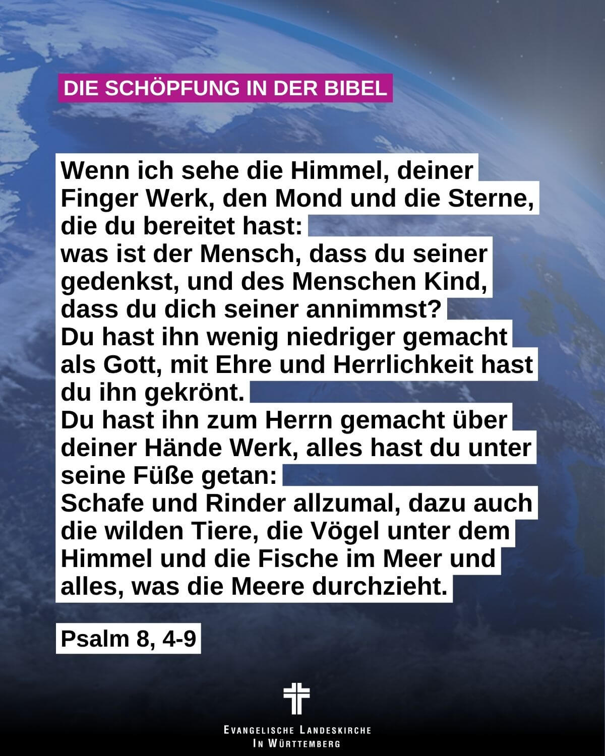 Wenn ich sehe die Himmel, deiner Finger Werk, den Mond und die Sterne, die du bereitet hast: was ist der Mensch, dass du seiner gedenkst, und des Menschen Kind, dass du dich seiner annimmst? Du hast ihn wenig niedriger gemacht als Gott, mit Ehre und Herrlichkeit hast du ihn gekrönt. Du hast ihn zum Herrn gemacht über deiner Hände Werk, alles hast du unter seine Füße getan: Schafe und Rinder allzumal, dazu auch die wilden Tiere, die Vögel unter dem Himmel und die Fische im Meer und alles, was die Meere durchzieht.
