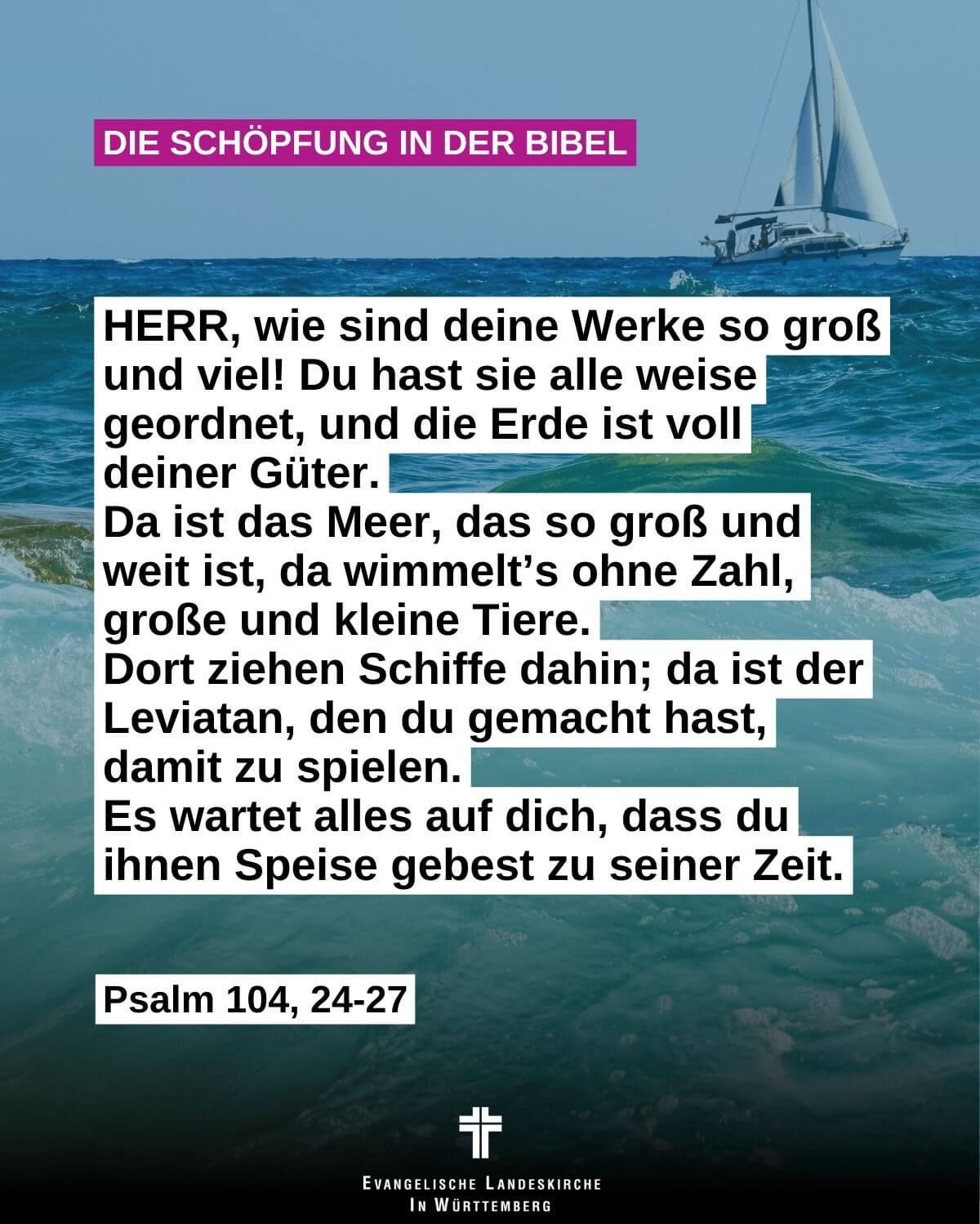 HERR, wie sind deine Werke so groß und viel! Du hast sie alle weise geordnet, und die Erde ist voll deiner Güter. Da ist das Meer, das so groß und weit ist, da wimmelt’s ohne Zahl, große und kleine Tiere. Dort ziehen Schiffe dahin; da ist der Leviatan, den du gemacht hast, damit zu spielen. Es wartet alles auf dich, dass du ihnen Speise gebest zu seiner Zeit.