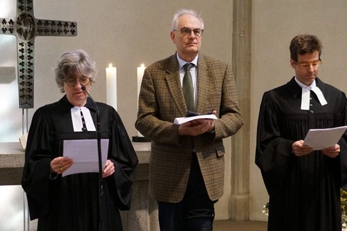 Prälatin Gabriele Arnold, Dekan Eckart Schultz-Berg und Pfarrer Matthias Vosseler setzen beim Mittagsgebet in der Stuttgarter Stiftskirche ein Zeichen gegen das Wegsehen und gegen Gewalt.