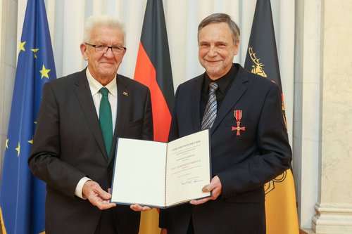 Ministerpräsident Winfried Kretschmann überreichte das Bundesverdienstkreuz an Dr. Joachim Hahn in Stellvertretung für Bundespräsident Frank-Walter Steinmeier.
