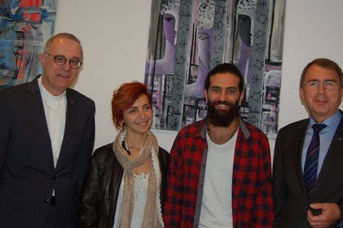 Landesbischof Frank Otfried July, Rasha Deeb, Ahmed Amer und Oberkirchenrat Dieter Kaufmann (v. li.) bei der Eröffnung der Ausstellung Frauen im Krieg und auf der Flucht.