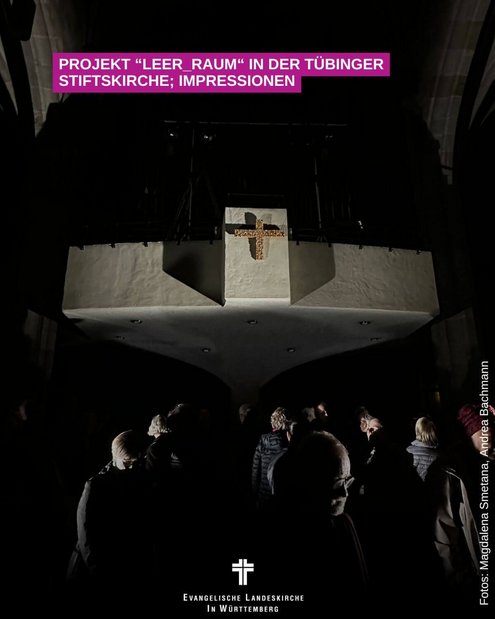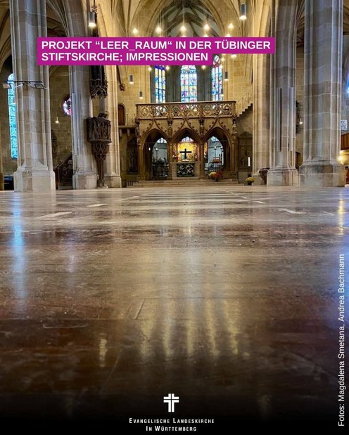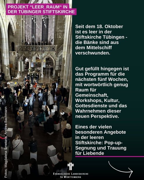 Die Tübinger Stiftskirchengemeinde hat für fünf Wochen (bis 24. November) in der Stiftskirche alle Bänke entfernt und so eine riesige leere Fläche geschaffen um auszuloten, wie sich dies auf das Erleben von Gottesdiensten, Konzerten und anderen Veranstaltungen auswirkt. Dabei experimentiert die Gemeinde auch mit ungewöhnlichen Gottesdienst-Formaten, etwa Pop-Up-Segungen und -Trauungen, einem Frauenmahl, einer Clubnacht mit DJ und einem ganz besonderen Gottesdienst für Angehörige Verstorbener. Hinzu kommen Konzerte, Tanz-Performances, Meditationsangebote, Taizé-Gottesdienste und vieles mehr.