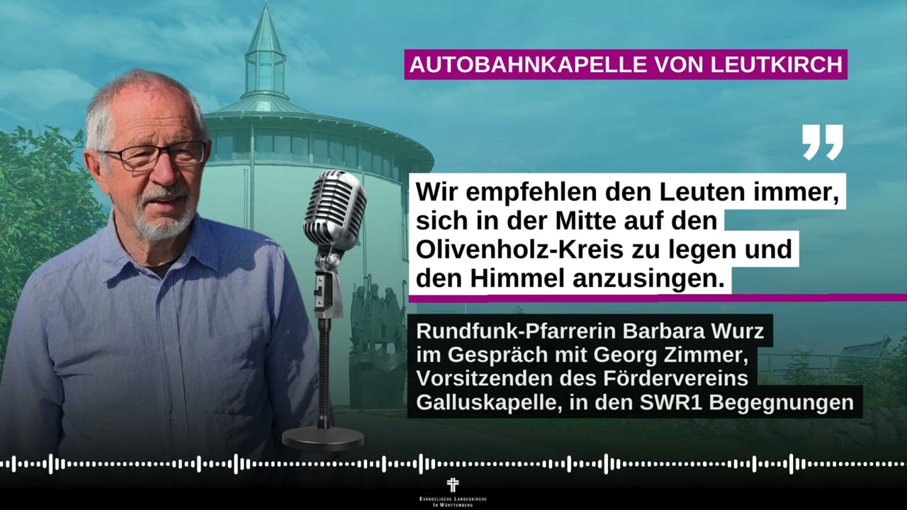 Barbara Wurz: Ich bin mit dem Auto auf der A96 unterwegs und mache Halt an der Raststätte „Winterberg“, um die Autobahnkapelle zu besuchen. Vom Parkplatz aus muss ich noch ein ziemlich steiles Stück den Berg hinauf. Aber es lohnt sich, denn oben angekommen erwartet mich nicht nur der weiß leuchtende Rundbau der Galluskapelle, sondern auch ein grandioser Ausblick: über Leutkirch und das Schwäbische Allgäu hinüber zu den Schweizer und österreichischen Alpen. Und mich erwartet mein heutiger Gesprächspartner, Georg Zimmer. Der hat vor etwas mehr als 25 Jahren den Bau der Kapelle initiiert. Er erzählt mir, wer die Menschen sind, die zur Galluskapelle kommen: