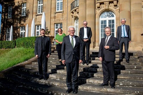 Austausch - v.l.n.r.: Erzbischof Stephan Burger (Erzdiözese Freiburg), Staatsministerin Theresa Schopper, Ministerpräsident Winfried Kretschmann, Landesbischof Dr. Frank Otfried July (Evangelische Landeskirche Württemberg), Generalvikar Dr. Clemens Stroppel (Diözese Rottenburg-Stuttgart) und Landesbischof Prof. Dr. Jochen Cornelius-Bundschuh (Evangelische Landeskirche Baden)