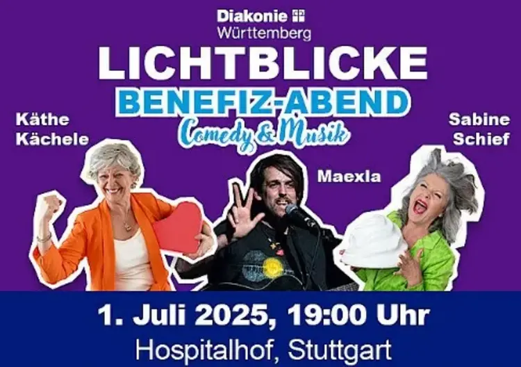 Die Diakonie Württemberg lädt am Dienstag, 1. Juli 2025, um 19 Uhr zum dritten Benefiz-Abend „Lichtblicke“ in den Hospitalhof Stuttgart ein. In diesem Jahr sorgen die Kabarettistinnen Käthe Kächele und Sabine Schief sowie Musiker Maexla mit geballter Comedy-Power aus dem Ländle und darüber hinaus für echte Lichtblicke.