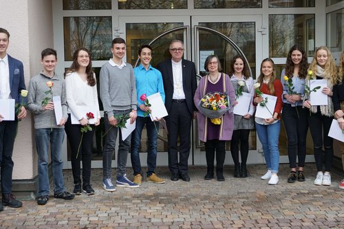 Preisträger des 16. Schülerwettbewerbs "Christentum und Kultur" mit Landesbischof July und einer Lehrerin