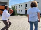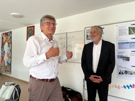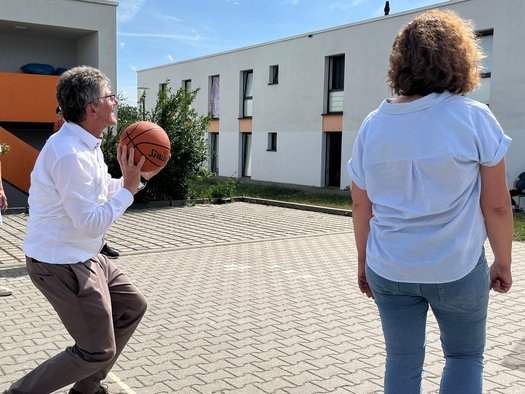 Zuvor hatten die beiden Vertreter der Kirchen in Württemberg, Ernst-Wilhelm Gohl, Landesbischof der Evangelischen Landeskirche in Württemberg, und Thomas Maria Renz, Weihbischof der Diözese Rottenburg-Stuttgart, eine Einrichtung in Stuttgart-Möhringen besucht, um die haupt- und ehrenamtliche Arbeit des Projekts „ZIFA-jobcoaching“ des Caritasverbandes für Stuttgart e.V. sichtbar zu machen und mit den Geflüchteten, die in der Initiative begleitet werden, direkt ins Gespräch zu kommen. Höhepunkt war ein gemeinsames Basketballspiel.