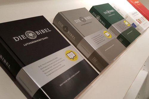 Ausgaben der Lutherbibel 2017 auf dem Messestand der Deutschen Bibelgesellschaft.