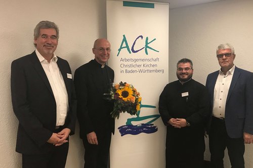 v.l.n.r.: Msgre. Dr. Heinz Detlef Stäps (neuer stellvertretender Vorsitzender, Weihbischof Dr. Peter Birkhofer ED (bisheriger Vorsitzender), Pfarrer Dimitrios Katsanos, Griechisch-Orthodoxe Kirche (neuer stellvertretender Vorsitzender), Prälat Prof. Dr. Traugott Schächtele, Evangelische Landeskirche in Baden (neuer ACK-Vorsitzender).