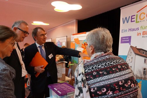 Intensiv informieren sich Landesbischof July, Oberkirchenrat Dieter Kaufmann und Christine Engelhardt vom baden-württembergischen Sozialministerium über inklusive Ansätze in den Gemeinden und der Diakonie