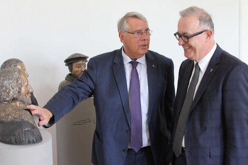 Der pfälzische Kirchenpräsident Christian Schad (l.) führt seinen Gast, den württembergischen Landesbischof Dr. h. c. Frank Otfried July, durch eine Austellung kirchlicher Kulturgüter.