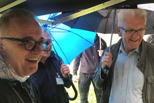 Der Berg hat zwar gerufen, die Feier aber fand schließlich in der Halle statt: Landesbischof Dr. h. c. Frank Otfried July (l.) und Ministerpräsident Winfried Kretschmann (Grüne) im Regen auf dem Jusi.