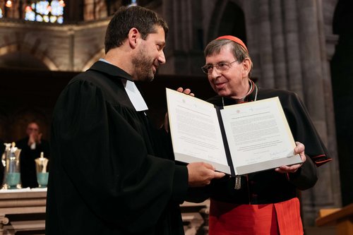 Unterzeichnung der Absichtserklärung zu einem gemeinsamen Dialog zwischen GEKE Ratspräsident Gottfried Locher und Kardinal Kurt Koch während des Schweizertags im Basler Münster.