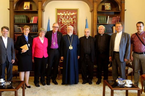 Delegation v.l.n.r: Sprecher der Landeskirche Oliver Hoesch, Oberkirchenrätin Marianne Wagner, Vorsitzende der EMS-Vollversammlung, Synodalpräsidentin Inge Schneider, Landesbischof Dr. h. c. Frank Otfried July, Catholicus Aram I., Pfarrer Habib Badr, National Church of Beirut, Kirchenrat Klaus Rieth, Pfarrer Uwe Gräbe, Nahost-Kenner und Geschäftsführer der Evangelischen Schneller-Schulen, Marcus Mockler, epd.